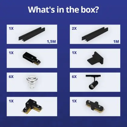 | Herstellername | Complete L shaped 1-Phase Track Set Black incl. 6x Spot fixture + GU10 2700K 3W Dim – 1,5 x 2 meter | |