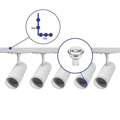 Beschreibung Komplettset 1-Phasen Rail L 1 x 2 Meter Weiß | incl. 5x Spot + GU10 2700K 3W Dimmbar + Abschlusskappe, Stromanschluss und L -Verbinder