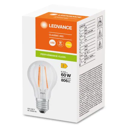 Die Ledvance Classic LED E27 Birne Fadenlampe Klar 6.5W 806lm - 827 Extra Warmweiß | Ersatz für 60W ist eine effiziente E27 LED-Lampe mit Retrodesign und der perfekte Ersatz für Ihre konventionellen 60W Lampen mit E27. Zudem strahlt sie Licht in der Farbtemperatur 2700K - Extra Warmweiß aus und punktet durch eine lange Lebensdauer.