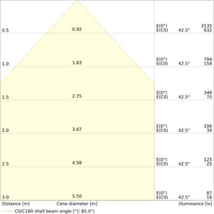 Beispiel: Wird eine Lampe mit einem Abstrahlwinkel von 60 Grad an der Decke (2,5 m Höhe) angebracht, erzeugt sie einen Lichtkegel von 2,9 Metern Durchmesser. Hat die Lampe hingegen einen Abstrahlwinkel von 120 Grad, beträgt der Lichtkegel 8,7 Meter im Durchmesser. |