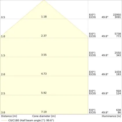 Beispiel: Wird eine Lampe mit einem Abstrahlwinkel von 60 Grad an der Decke (2,5 m Höhe) angebracht, erzeugt sie einen Lichtkegel von 2,9 Metern Durchmesser. Hat die Lampe hingegen einen Abstrahlwinkel von 120 Grad, beträgt der Lichtkegel 8,7 Meter im Durchmesser. |