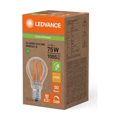 Die Ledvance LED Classic E27 Birne Fadenlampe Klar 5.7W 1055lm - 827 Extra Warmweiß | Ersatz Für 75W ist eine effiziente E27 LED-Lampe mit Retrodesign und der perfekte Ersatz für Ihre konventionellen 75W Lampen mit E27. Zudem strahlt sie Licht in der Farbtemperatur 2700K - Extra Warmweiß aus und punktet durch eine lange Lebensdauer.