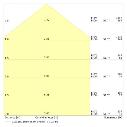 Beispiel: Wird eine Lampe mit einem Abstrahlwinkel von 60 Grad an der Decke (2,5 m Höhe) angebracht, erzeugt sie einen Lichtkegel von 2,9 Metern Durchmesser. Hat die Lampe hingegen einen Abstrahlwinkel von 120 Grad, beträgt der Lichtkegel 8,7 Meter im Durchmesser. |