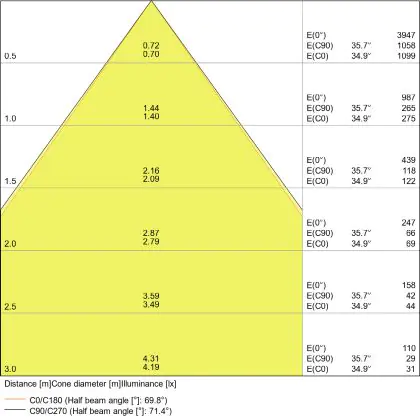 Beispiel: Wird eine Lampe mit einem Abstrahlwinkel von 60 Grad an der Decke (2,5 m Höhe) angebracht, erzeugt sie einen Lichtkegel von 2,9 Metern Durchmesser. Hat die Lampe hingegen einen Abstrahlwinkel von 120 Grad, beträgt der Lichtkegel 8,7 Meter im Durchmesser. |