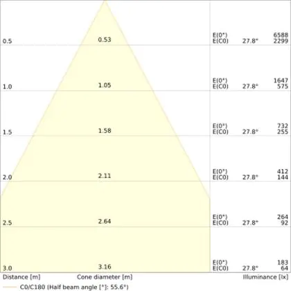 Beispiel: Wird eine Lampe mit einem Abstrahlwinkel von 60 Grad an der Decke (2,5 m Höhe) angebracht, erzeugt sie einen Lichtkegel von 2,9 Metern Durchmesser. Hat die Lampe hingegen einen Abstrahlwinkel von 120 Grad, beträgt der Lichtkegel 8,7 Meter im Durchmesser. |