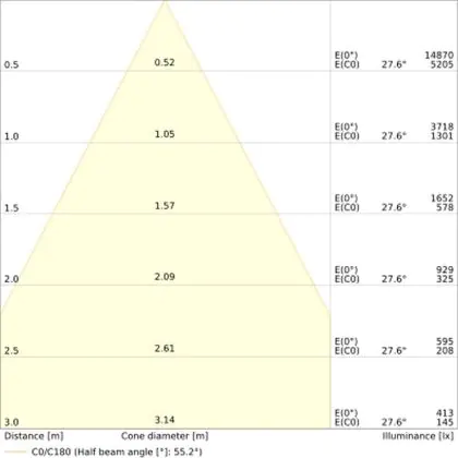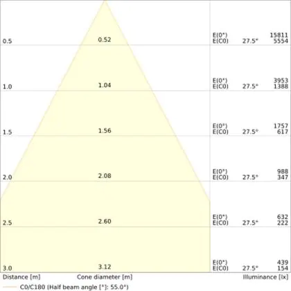 Beispiel: Wird eine Lampe mit einem Abstrahlwinkel von 60 Grad an der Decke (2,5 m Höhe) angebracht, erzeugt sie einen Lichtkegel von 2,9 Metern Durchmesser. Hat die Lampe hingegen einen Abstrahlwinkel von 120 Grad, beträgt der Lichtkegel 8,7 Meter im Durchmesser. |