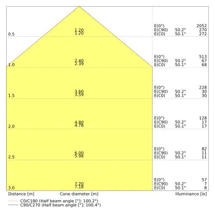 Beispiel: Wird eine Lampe mit einem Abstrahlwinkel von 60 Grad an der Decke (2,5 m Höhe) angebracht, erzeugt sie einen Lichtkegel von 2,9 Metern Durchmesser. Hat die Lampe hingegen einen Abstrahlwinkel von 120 Grad, beträgt der Lichtkegel 8,7 Meter im Durchmesser. |