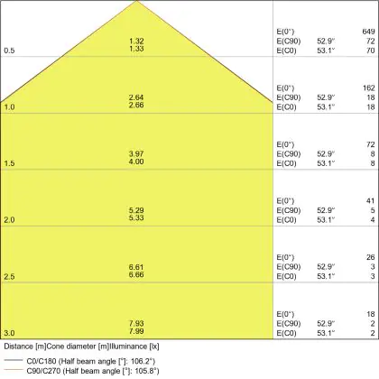 Beispiel: Wird eine Lampe mit einem Abstrahlwinkel von 60 Grad an der Decke (2,5 m Höhe) angebracht, erzeugt sie einen Lichtkegel von 2,9 Metern Durchmesser. Hat die Lampe hingegen einen Abstrahlwinkel von 120 Grad, beträgt der Lichtkegel 8,7 Meter im Durchmesser. |