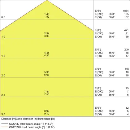 Beispiel: Wird eine Lampe mit einem Abstrahlwinkel von 60 Grad an der Decke (2,5 m Höhe) angebracht, erzeugt sie einen Lichtkegel von 2,9 Metern Durchmesser. Hat die Lampe hingegen einen Abstrahlwinkel von 120 Grad, beträgt der Lichtkegel 8,7 Meter im Durchmesser. |