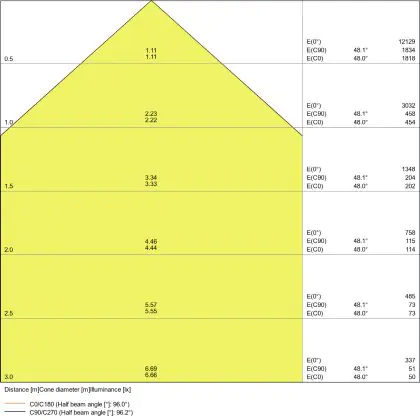 Beispiel: Wird eine Lampe mit einem Abstrahlwinkel von 60 Grad an der Decke (2,5 m Höhe) angebracht, erzeugt sie einen Lichtkegel von 2,9 Metern Durchmesser. Hat die Lampe hingegen einen Abstrahlwinkel von 120 Grad, beträgt der Lichtkegel 8,7 Meter im Durchmesser. |