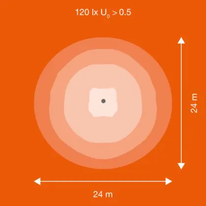 Beispiel: Wird eine Lampe mit einem Abstrahlwinkel von 60 Grad an der Decke (2,5 m Höhe) angebracht, erzeugt sie einen Lichtkegel von 2,9 Metern Durchmesser. Hat die Lampe hingegen einen Abstrahlwinkel von 120 Grad, beträgt der Lichtkegel 8,7 Meter im Durchmesser. |