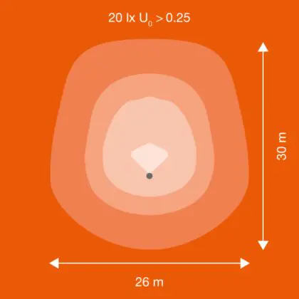 Beispiel: Wird eine Lampe mit einem Abstrahlwinkel von 60 Grad an der Decke (2,5 m Höhe) angebracht, erzeugt sie einen Lichtkegel von 2,9 Metern Durchmesser. Hat die Lampe hingegen einen Abstrahlwinkel von 120 Grad, beträgt der Lichtkegel 8,7 Meter im Durchmesser. |