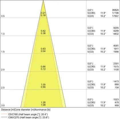 Beispiel: Wird eine Lampe mit einem Abstrahlwinkel von 60 Grad an der Decke (2,5 m Höhe) angebracht, erzeugt sie einen Lichtkegel von 2,9 Metern Durchmesser. Hat die Lampe hingegen einen Abstrahlwinkel von 120 Grad, beträgt der Lichtkegel 8,7 Meter im Durchmesser. |