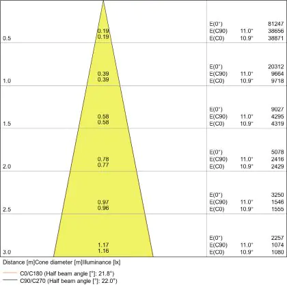 Beispiel: Wird eine Lampe mit einem Abstrahlwinkel von 60 Grad an der Decke (2,5 m Höhe) angebracht, erzeugt sie einen Lichtkegel von 2,9 Metern Durchmesser. Hat die Lampe hingegen einen Abstrahlwinkel von 120 Grad, beträgt der Lichtkegel 8,7 Meter im Durchmesser. |