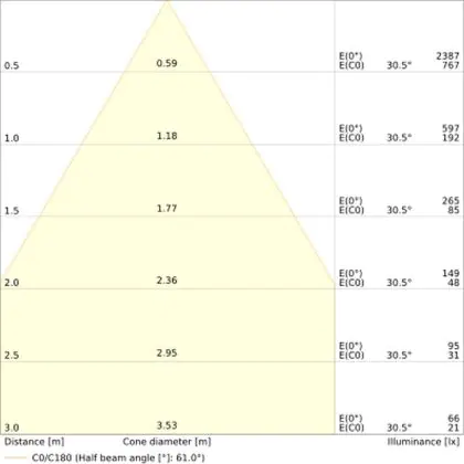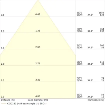 Beispiel: Wird eine Lampe mit einem Abstrahlwinkel von 60 Grad an der Decke (2,5 m Höhe) angebracht, erzeugt sie einen Lichtkegel von 2,9 Metern Durchmesser. Hat die Lampe hingegen einen Abstrahlwinkel von 120 Grad, beträgt der Lichtkegel 8,7 Meter im Durchmesser. |