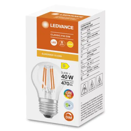Die Ledvance Superior Classic LED E27 Kugel Fadenlampe Klar 3.4W 470lm - 927 Extra Warmweiß | Dimmbar - Höchste Farbwiedergabe ist eine effiziente E27 LED-Lampe mit Retrodesign und der perfekte Ersatz für Ihre konventionellen 40W Lampen mit E27. Zudem strahlt sie Licht in der Farbtemperatur 2700K - Extra Warmweiß aus und punktet durch eine lange Lebensdauer.