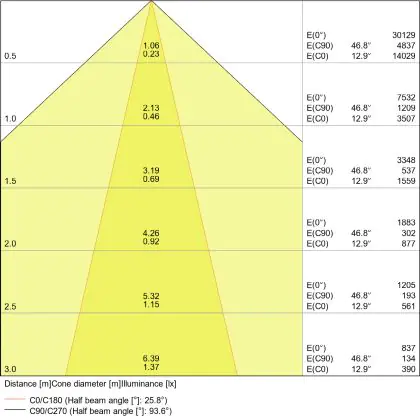 Beispiel: Wird eine Lampe mit einem Abstrahlwinkel von 60 Grad an der Decke (2,5 m Höhe) angebracht, erzeugt sie einen Lichtkegel von 2,9 Metern Durchmesser. Hat die Lampe hingegen einen Abstrahlwinkel von 120 Grad, beträgt der Lichtkegel 8,7 Meter im Durchmesser. |