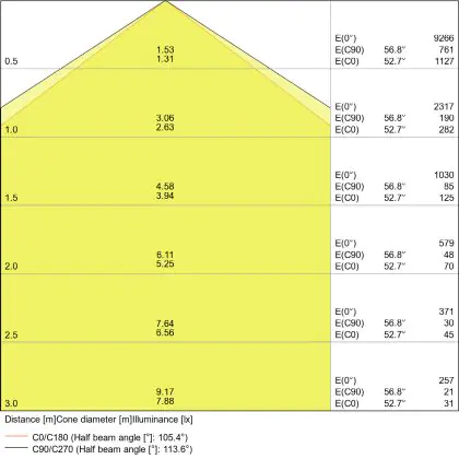Beispiel: Wird eine Lampe mit einem Abstrahlwinkel von 60 Grad an der Decke (2,5 m Höhe) angebracht, erzeugt sie einen Lichtkegel von 2,9 Metern Durchmesser. Hat die Lampe hingegen einen Abstrahlwinkel von 120 Grad, beträgt der Lichtkegel 8,7 Meter im Durchmesser. |