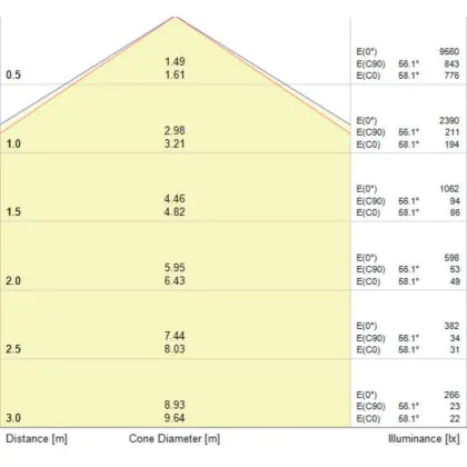 Beispiel: Wird eine Lampe mit einem Abstrahlwinkel von 60 Grad an der Decke (2,5 m Höhe) angebracht, erzeugt sie einen Lichtkegel von 2,9 Metern Durchmesser. Hat die Lampe hingegen einen Abstrahlwinkel von 120 Grad, beträgt der Lichtkegel 8,7 Meter im Durchmesser. |