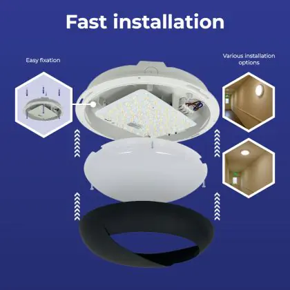 Die Noxion LED-Wand- und Deckenleuchte Pro V2 Weiß 12/16/20W 2400lm - 830-840-865 CCT | 325mm - IP65 - Not 3H + Augenlid Ring Schwarz ist eine Feuchtraumleuchte. Sie strahlt Licht in der Farbtemperatur aus und punktet durch eine lange Lebensdauer. Diese Leuchte ist speziell zur Verwendung in Feuchträumen (Keller, Waschräume, etc.) vorgesehen.