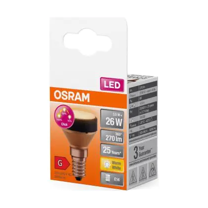 Die Osram LED Eben Lamp E14 Special Matt 3.5W 270lm - 827 Extra Warmweiß | 3-Stufen Dimmbar - Ersatz Für 25W ist eine effiziente E14 LED-Lampe und der perfekte Ersatz für Ihre konventionellen 25W Lampen mit E14-Sockel. Zudem strahlt sie Licht in der Farbtemperatur 2700K - Extra Warmweiß aus und punktet durch eine lange Lebensdauer.