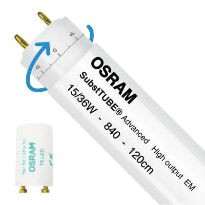Die Osram SubstiTUBE Advanced Ultra Output EM ist eine T8 LED Röhre mit einem G13 Sockel für Anwendungsbereiche wie z.B. Beleuchtung von Produktionsbereichen, Verkehrszonen, Korridoren, Supermärkte, Kaufhäuser und Industrie. Die Röhre besitzt eine Länge von 120 cm und ist in verschiedenen Farbtemperaturen erhältlich. Sie ersetzt herkömmliche T8 Leuchtstoffröhren mit 36 W. Diese Röhren sind nur für den Innenbereich verfügbar und können nur mit geeigneter Leuchte im Außenbereich genutzt werden. Die integrierten LED-Chips besitzen eine Lebensdauer von 60.000 Stunden, was in einer durchschnittlichen Anwendung von mehr als 15 Jahren entspricht. Durch den Wechsel zu LED, können Sie bis zu 70 % Energie einsparen. Durch die nicht benötigten Wartungs- und Ersatzkosten, ist eine kurze Amortisationszeit ebenfalls garantiert.