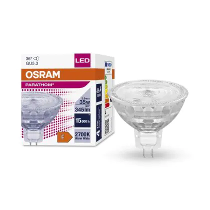 Die Osram Parathom LED-Spot GU5.3 MR16 3.8W 345lm 36D - 827 Extra Warmweiß | Ersatz für 35W ist eine effiziente GU5.3 LED-Lampe und der perfekte Ersatz für Ihre konventionelle Halogenlampe mit 35W und einem GU5.3-Sockel, bei dem die beiden Stifte einen Abstand von 5,3 mm zueinander haben. Die Abkürzung MR16 zeigt Ihnen, dass der Reflektor einen Durchmesser von 5 cm hat. Zudem strahlt das Produkt Licht in der Farbtemperatur 2700K - Extra Warmweiß aus und punktet durch eine lange Lebensdauer.