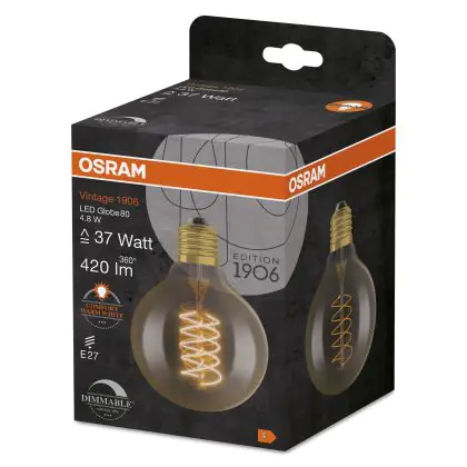 Die Osram Vintage 1906 LED E27 Globe Filament Gold 80mm 4.8W 420lm - 822 Extra Warm White | Dimmable ist eine effiziente E27 LED-Lampe mit Retrodesign und der perfekte Ersatz für Ihre konventionellen 37W Lampen mit E27. Zudem strahlt sie Licht in der Farbtemperatur 2200K - Extra Warmweiß aus und punktet durch eine lange Lebensdauer.