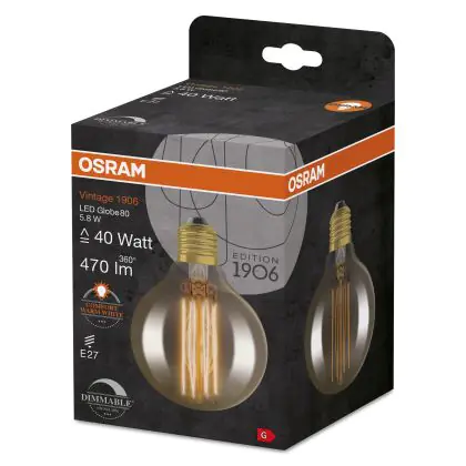 Die Osram Vintage 1906 LED E27 Globe Filament Gold 80mm 5.8W 470lm - 822 Extra Warm White | Dimmable ist eine effiziente E27 LED-Lampe mit Retrodesign und der perfekte Ersatz für Ihre konventionellen 40W Lampen mit E27. Zudem strahlt sie Licht in der Farbtemperatur 2200K - Extra Warmweiß aus und punktet durch eine lange Lebensdauer.