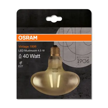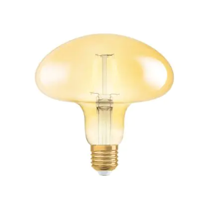 Die Osram Vintage 1906 LED E27 Mushroom 4.5W 825 Gold | Ersetzt 40W ermöglicht enorme Energieeinsparungen von bis zu 90 %. Dank des Standard-E27-Sockels klappt der Umstieg auf LED besonders einfach. Die Goldbeschichtung und die sichtbaren Filamentstäbe im Inneren des Leuchtkörpers machen die Vintage-LED zu einem echten Highlight. Der Leuchtkörper ist begeistert mit einer Pilz-Form.