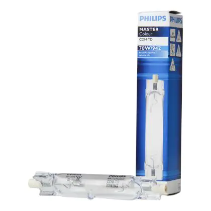 CDM-TD sind zweiseitige kompakte Entladungslampen mit einem brillanten Licht und ausgezeichneter Farbstabilität aufgrund ihrer Keramik-Brenner-Technologie. Die Philips CDM-TD 70W 942 RX7s (MASTERColour) besitzt einen RX7S Gasentladungslampensockel. Diese Lampen sind nicht dimmbar.