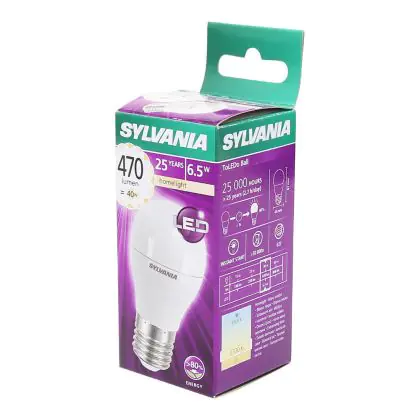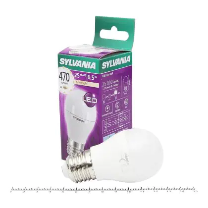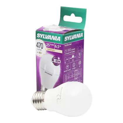 Die Sylvania ToLEDo Ball E27 Matt zeichnet sich durch einen geringen Stromverbrauch von nur 6,5 Watt aus. Dies ermöglicht Ihnen erhebliche Energieeinsparungen. Die LED hat einen E27-Sockel, sowie eine P45-Ballform, und spendet warmes Licht mit einer Farbtemperatur von 2.700 Kelvin.